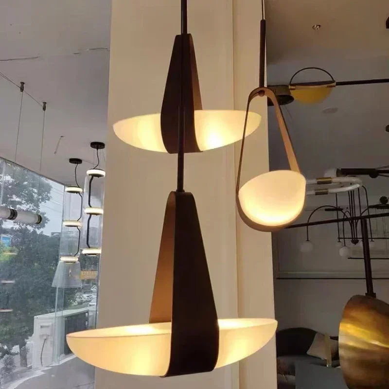Suspension Design Minimaliste Cuir Et Verre LED sublime l’intérieur avec lumière douce et matériaux élégants, alliant cuir et verre pour ambiance chic.