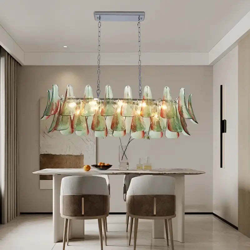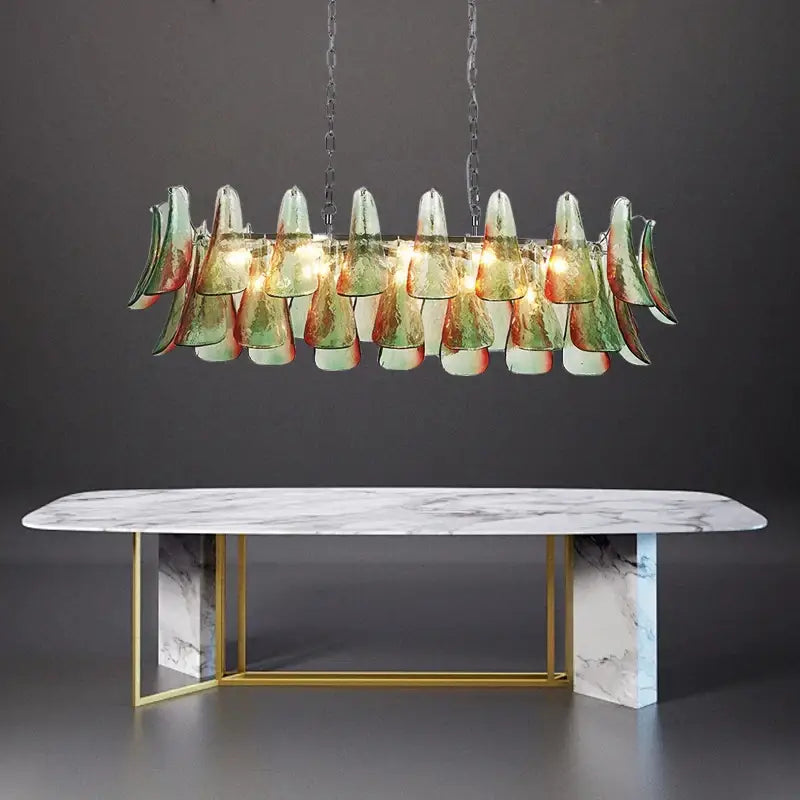 Suspension En Verre Soufflé Coloré Style Moderne Élégant valorise la lumière artificielle en la transformant en un élément décoratif à part entière. L’éclairage subtil et réfléchi qu’elle diffuse est idéal pour instaurer une ambiance chaleureuse et accueillante, tout en mettant en valeur les éléments architecturaux et décoratifs de la pièce.