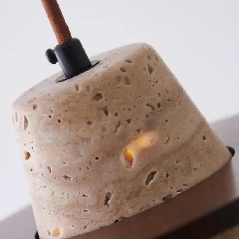 Suspension luminaire de chambre en pierre beige et bois foncé, alliance naturelle pour une ambiance apaisante et élégante.