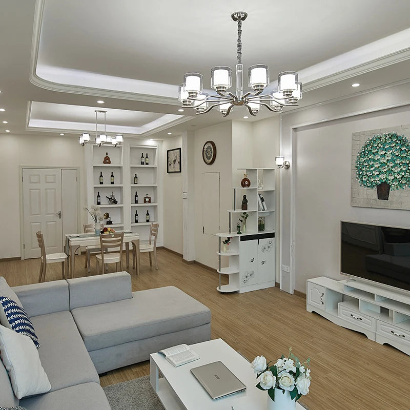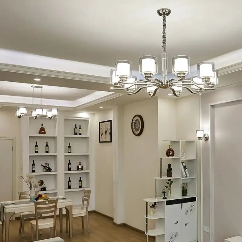 Suspension moderne chromé à abat-jour cylindriques : un luminaire design et élégant qui transforme votre décor en un véritable espace lumineux contemporain.