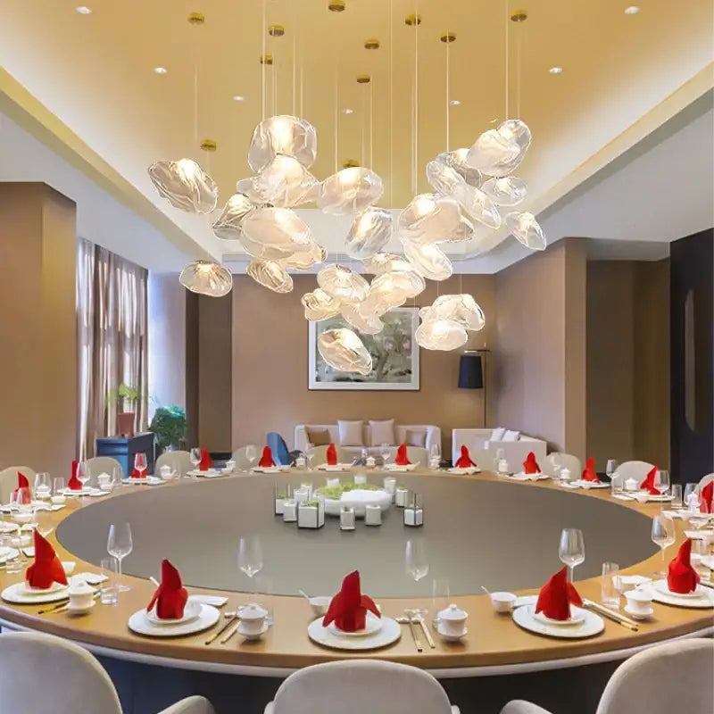Suspension nuage design sculptural en verre transparent apporte une élégance aérienne et poétique, lumière diffuse et atmosphère raffinée.