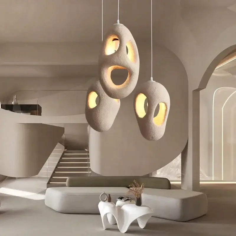 Ce qui séduit immédiatement dans la suspension organique en plâtre blanc design brut et sculptural, c’est son pouvoir décoratif au-delà de sa fonction lumineuse. Elle s’apparente à une sculpture contemporaine, capable de transformer un espace anodin en une galerie d’art moderne. Elle trouve sa place dans un intérieur minimaliste où elle devient la pièce maîtresse, ou dans un décor plus éclectique où elle vient créer une rupture artistique. Sa présence suffit à métamorphoser un salon, une salle à manger ou même une entrée, lui conférant une atmosphère unique et raffinée. Elle incarne cette frontière floue entre l’objet fonctionnel et l’œuvre d’art, ce qui en fait un choix privilégié des amateurs de design.